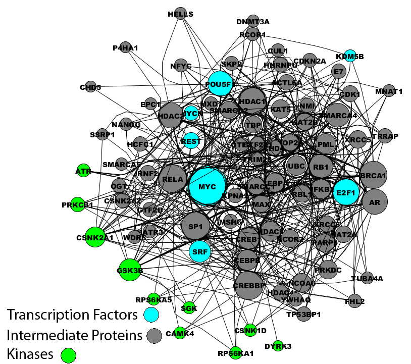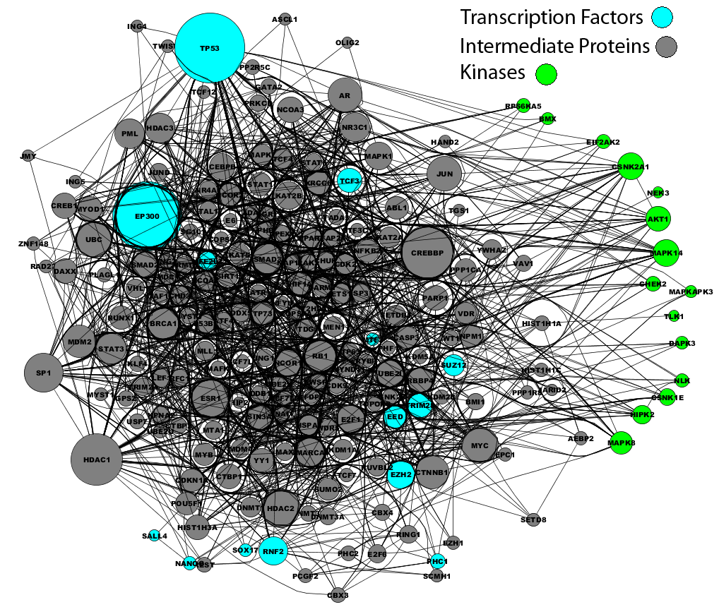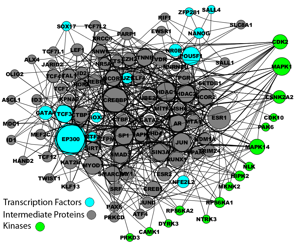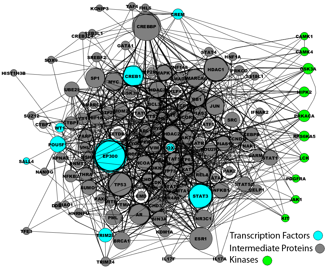 Using the top 15 predicted transcription factors as seeds for building a larger protein complex with X2K, we identified a subnetwork of 95 intermediate proteins that connect the transcription factors using known protein-protein interactions, as well as the most likely protein kinases that phosphorylate the predicted protein complex. Among the predicted kinases is Akt, which is known to be activated downstream of the profibrogenic cannabinoid receptor CB1R to promote HSC survival during liver injury.[4] Akt has also been shown to mediate the anti-apoptotic effect and profibrogenic properties of leptin in HSCs[5], to mediate PDGF-induced proliferation signals, and to regulate collagen type I expression in activated HSCs.[6] Another predicted kinase, RPS6KA6 (RSK4), is a member of the RSK family of serine/threonine kinases that can phosphorylate C/EBPbeta, an adipogenic transcription factor known to regulate collagen type I expression. Rsk-mediated phosphorylation of C/EBPbeta at Thr217 appears to be crucial for the progression of fibrosis; Rsk inhibition led to regression of fibrosis in CCl4-treated mice, and increased activation of RSK and phosphorylated C/EBPbeta both were found in activated HSCs of liver fibrosis patients.[7] Although this study and others examining RSK in HSCs were not isoform-specific, it would be interesting to investigate whether there is distinct contribution of the RSKs we identified to HSC activation.