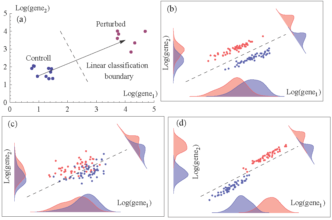 Fig. 1. Toy example to demonstrate the concept of the Characteristic Direction identified with a hyperplane which defines the boundary of a linear classification between two sets of gene expression profiles. a) The boundary in gene expression space is represented by a dashed line, whereas the perpendicular direction is indicated by an arrow. b-d) Illustrative examples of the distribution of expression profiles in two-dimensional logarithmic gene expression space, along with the distributions as projected onto the gene axes and the direction perpendicular to the classification boundary hyperplane.